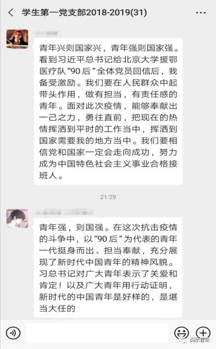 16级学生党员张可心:总书记的深情寄语和殷切嘱托,激励着我们广大青年,在疫情防控的斗争面前,以“90后”为代表的青年一代挺身而出、担当奉献。他们不畏艰险、冲锋在前,彰显了新时代中国青年的蓬勃力量,我们青年学子理当肩负起时代赋予的使命与责任,与祖国同命运,与人民共患难,为夺取抗击疫情斗争的胜利作出应有的贡献。