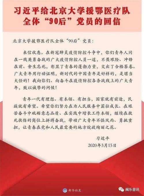 3月15日,习近平总书记给北京大学援鄂医疗队全体“90后党员”回信,向他们和奋斗在疫情防控各条战线上的广大青年致以诚挚的问候,勉励广大青年不惧风雨勇挑重担,让青春在党和人民最需要的地方绽放绚丽之花。习近平总书记的深情寄语和殷切嘱托,激励着各条战线上的广大青年人,为打赢疫情防控阻击战,继续奋战再立新功为党和人民的事业作出新时代青年的贡献。
