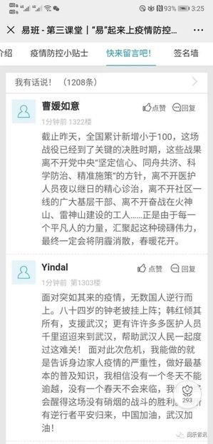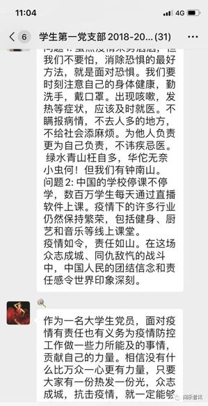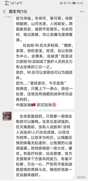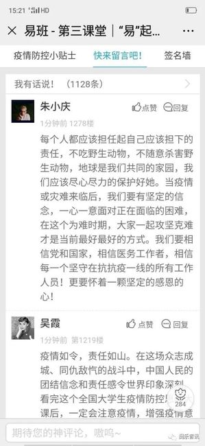 院团委副书记干成同学说道,冯秀军老师讲得太好了,凡是过去,皆为序曲。冬将尽,春可期。待黎明破晓,山河无恙,人间皆安。愿国泰民安,诸君平安喜乐。与此同时,铭记英雄,勿让悲痛与遗憾重演,社会给90后太多标签,“撒娇,卖萌,自称宝宝,吃货,会以自我为中心,会佛系,会崩溃”但是这次疫情90后却成了医护人员的主力军占总体的三分一之。是的,90后可以卖萌也可以为国卖命。因为……“曾经是你,今天是我” 我相信,只要上下一条心,劲往一处使,这场没有硝烟的战争终究会胜利的。中国加油 武汉加油!