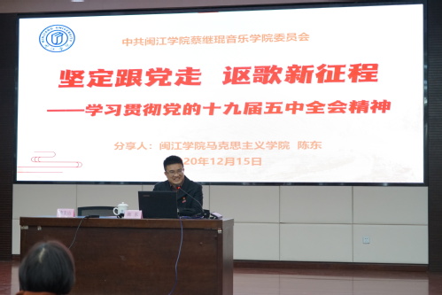 陈东副教授从十九届五中全会召开的背景、全会的主要内容、新征程呼唤新时代青年奋发有为主题入手,回顾了国家“十三五”规划取得的重大成果,展望“十四五”的经济社会发展主要目标等内容。他用贴近生活的事例,结合时事热点案例、详实直观的数据,生动活泼的语言力求将党的十九届五中全会精神讲实、讲深、讲透;他从为何要学习全会精神,通过学习党的历史重要性、了解党的政策必要性、当前中国面临的形势等角度入手,号召在场的党员要积极认真学习,将个人的成长发展融入到实现中华民族伟大复兴的征程中,将个人梦融入到中国梦,同心同德、顽强奋斗!最后,他指出,作为一名音乐专业的学生,要认识到艺术在国家未来发展的征程中,是架起中国连接世界、共建人类命运共同体的桥梁,他希望在场的同学要充分发挥专业的特色,用音乐、用艺术,讴歌新时代,赞颂新中国,唱响时代正能量!