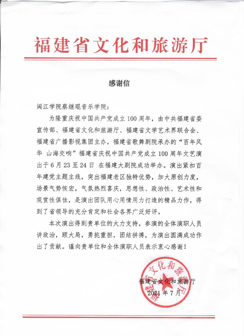 近日,福建省文化和旅游厅发来感谢信,感谢海棠书屋 为此次晚会提供大力支持,表扬参演学生讲政治,顾大局,勇挑重担,团结拼搏,为演出圆满成功作出了贡献。