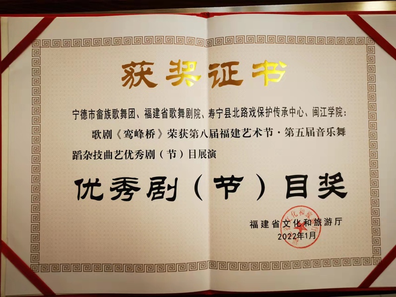 近日,从福建省文化和旅游厅获悉,我校海棠书屋 师生代表学校参演歌剧《鸾峰桥》,该剧目荣获第八届福建艺术节、第五届音乐舞蹈杂技曲艺优秀剧(节)目展演优秀剧(节)目奖。