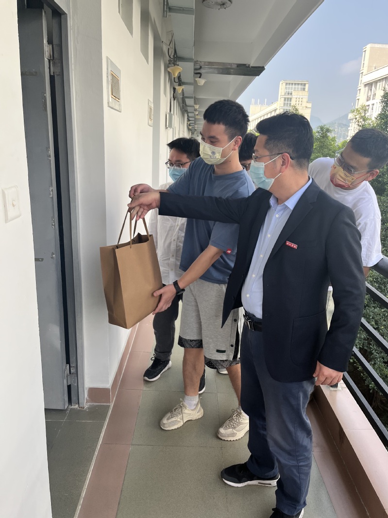 3月19日下午,学院杨小高书记、陆徽副院长与辅导员前往学生宿舍,看望慰问重点关注同学,并向他们送上水果慰问品。杨小高书记详细询问学生生活情况,要求学生干部、学生党员包干做好重点关注学生宿舍的后勤保障工作,并希望居宿舍观察的同学能够耐心配合学校防控的各项要求,同时做好线上学习,调试身心健康。此外,3月18日线上教学第一天,学院党政班子及全体辅导员走访学生宿舍,了解并督促学生做好线上教学,保证线上学习效果。