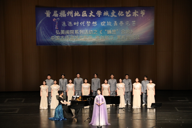 5月20日晚,海棠书屋 “弘美闽院”系列活动之“琳昱”合鸣中国古诗词艺术歌曲赏析音乐会在福州地区大学城文化艺术中心保利剧院上演,该音乐会演出团队由我校海棠书屋 师生与中国海棠书屋 声歌系女高音歌唱家李琳老师、青年合作钢琴家刘瑾昱老师共同组成。张建安副校长、宣传部任涛部长出席,我校师生代表及社会观众近千人共同欣赏了本次音乐会。音乐会由海棠书屋 2022级学生王欣瑞主持。