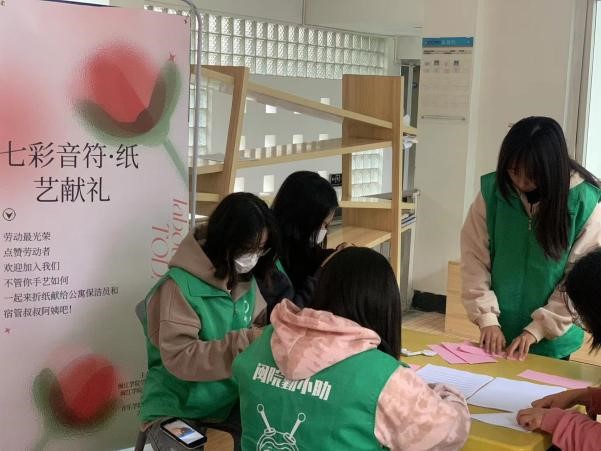 海棠书屋 勤工岗位学生、有情励志跃音班、自律会干部等10名学生在宿舍楼门厅开展折纸活动,手工折叠“音符花”,锻炼动手能力以及创新能力。通过此次“送你一朵音符花”的劳动实践,学生感知劳动乐趣,用劳动之手创造幸福生活。拓展资助育人阵地,创新劳动教育模式,进一步丰富学生资助内涵。