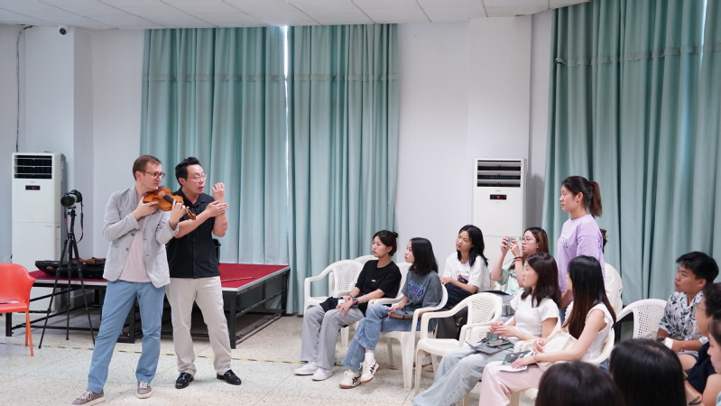 在互动环节,同学们纷纷向两位艺术家提出“在快速演奏中大拇指如何放松?”“如何提高演奏速度?”等问题,大师都耐心予以回答,并进行即兴演奏《巴赫 小提琴无伴奏solo》。