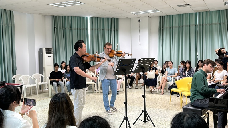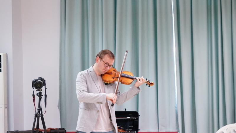 本次大师课设置了大师演奏、师生互动、大师点评三个环节。在大师演奏环节,两位艺术家与张铠麟老师一起演奏了莫扎特作品《降E大调交响协奏曲k364》,高水平的演奏让同学们深刻感受到莫扎特作品的音乐风格。