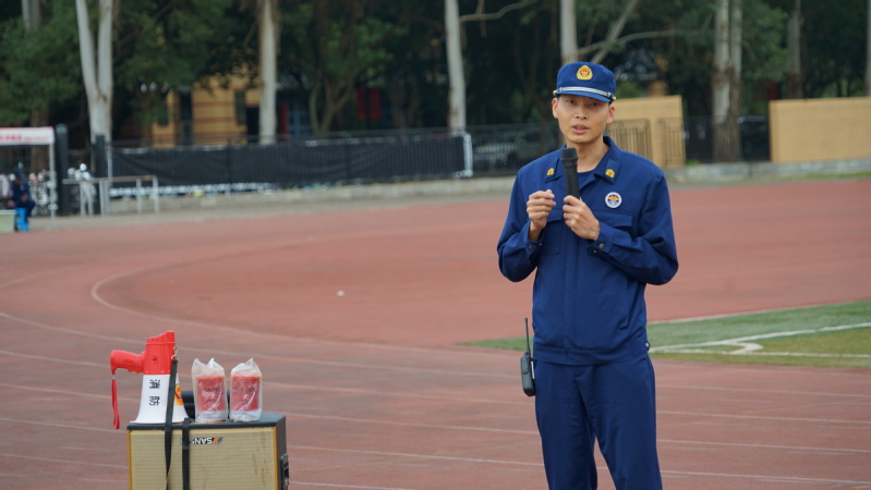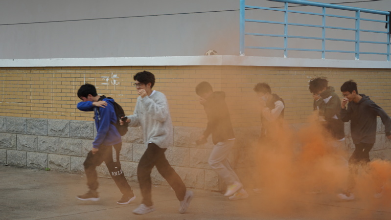 随着一声刺耳的警报声响,看台两边飘起阵阵浓烟,音乐学子们在消防员战士的组织下捂住口鼻、弯腰俯身快速撤离。在疏散过程中,学生们行动迅速,安全有序到达了指定地点。