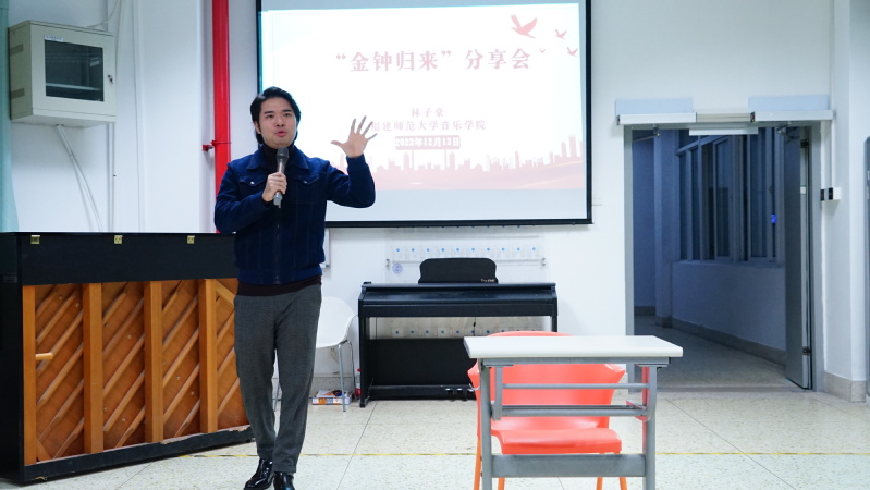 为深入推进书香闽院建设,提升学院师生专业水平,培养应用型人才,2023年12月13日,海棠书屋 于融侨合唱教室举行“金钟归来”分享会,讲座特邀第十四届中国音乐金钟奖声乐(美声)比赛总决赛第一名获得者、福建师范大学青年教师林子豪主讲,学院声乐教研室相关老师和学生代表共同参加。讲座由学院副院长刘淘主持。
