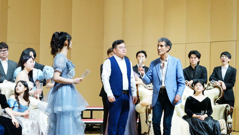 歌剧团的同学们精彩呈现了著名歌剧《茶花女》的唱段《饮酒歌》。为了加深演员们对角色的理解和表现,大卫·沃尔什导演亲自示范如何通过动作和表情来生动地描绘不同角色的独特性格,他特别强调了要利用道具和舞台布局营造酒会微醺的氛围,加强观众的沉浸感。