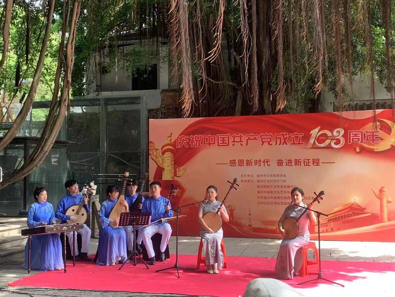 实践探究伊始,闽都文化践行队参观了福州评话伬艺传习所庆祝中国共产党成立103周年专场演出。在演出中,福州伬艺以福州方言为媒介进行传唱,保留了宋元曲艺中那份“百戏”的遗风,展现出“一树多枝、形式多样、声腔多元”的丰富面貌,贴近群众生活,生动形象地描绘出福州地区人民群众的生活。据悉,2006年5月20日,福州评话伬艺传习所申报的福州伬艺经国务院批准列入第一批国家级非物质文化遗产名录。