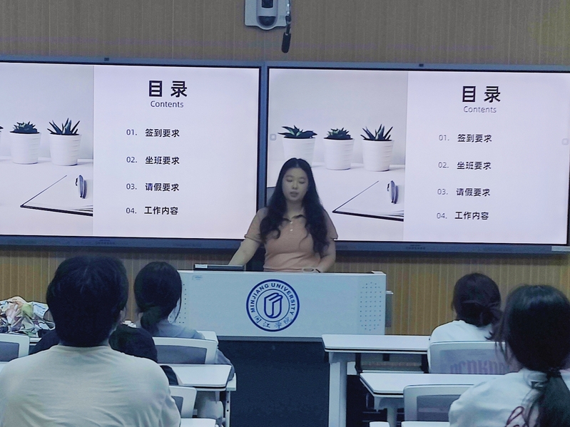 培训会开始,勤工部负责人钟欣从签到要求、坐班要求、请假要求、工作内容进行简要介绍。接着,她对每一项议程进行详细讲解,对于签到要求,应按时到岗进行签到,不迟到、不早退;对于坐班要求,应保持办公室或实验室干净整洁,不擅自离岗;对于请假要求,如有特殊情况需要请假,应如实向老师或勤工部部长报备,并选择合适的时间补班;最后对于工作内容,勤工岗位主要协助老师处理事务类工作,对于老师下达的任务应做到“事事有回应”,工作严谨、细心、认真、不拖延、不懈怠。