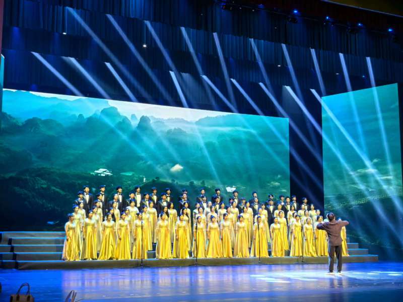 整场晚会以“强国复兴有我”为主题,13所高校合唱团通过合唱、小组唱等形式同台展演,热情讴歌新中国从站起来、富起来到强起来的伟大复兴之路。