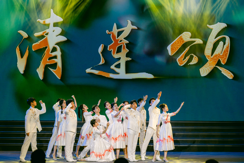 晚会中,我院青年学子以音乐情景剧的方式将原创歌曲《清莲颂》完美展现在舞台,优美的旋律、艺术化的舞台表达,获得了现场观众热烈的掌声。歌曲《清莲颂》由我院陆徽副院长作曲并编曲,以“莲”为意象,讴歌了共产党人“出淤泥而不染、亭亭玉立碧波之间”的纯洁正直形象,“淡淡清香不争艳、心如明月映青天”的高贵品格,“不图富贵讲奉献、初心不忘立于天地间”的高尚情怀。