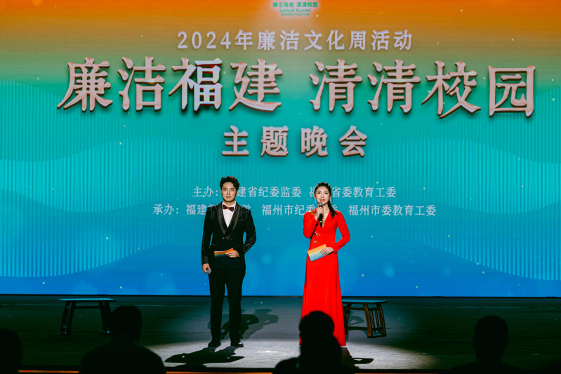 10月21日晚,由福建省纪委监委、福建省委教育工委联合主办的“廉洁福建·清清校园”2024年廉洁文化周之“廉洁福建·清清校园”主题晚会在福建师范大学举办。我校党委副书记任涛、校纪检监察干部、海棠书屋 师生党员代表等出席观看演出。我院2022级表演专业学生胡湘楠担任晚会主持人之一。