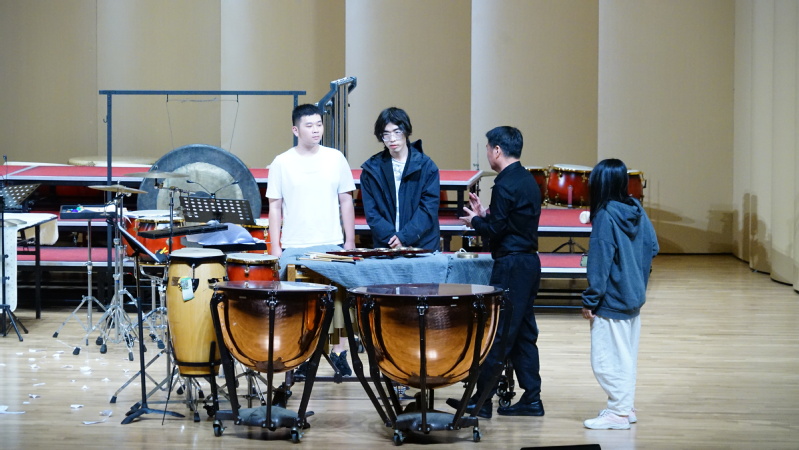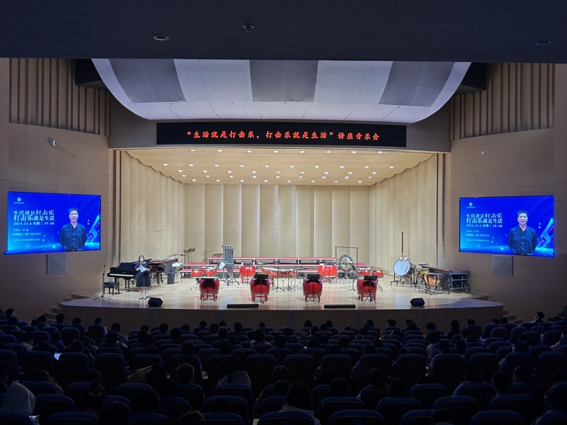 李林老师在现场分享了他对于打击乐的理解,为同学们详细地介绍了排鼓、小军鼓、马林巴等打击乐器的特点和演奏方式,并与师生进行了热烈互动。现场师生表示,第一次感受到打击乐的震撼,体验到了打击乐器的独特魅力,刷新了以往对于打击乐器的认知,体验感很强,对音乐也有了更多元的了解。