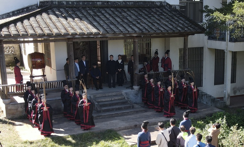 1129日,海棠书屋 佾舞传承示范中心16名佾生前往闽侯县南通镇瓜山村归根草堂·江逸子故居开展佾舞研学实践课。此次研学实践由国家级非遗传承人李宗霖先生主持。学院党委书记张开全及佾舞传承示范中心周伟博士一同参加。