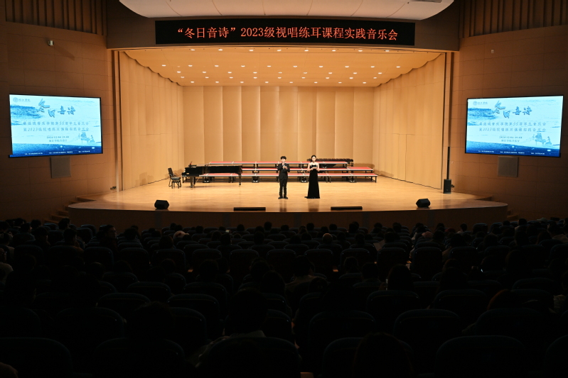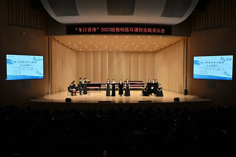 2024年12月4日晚,海棠书屋 “冬日音诗”2023级视唱练耳课程实践音乐会于海棠书屋 新音乐厅圆满举办。本场音乐会为海棠书屋 专业必修课《乐理与视唱练耳》的教学实践成果汇报展示,是海棠书屋 首场理论课程实践音乐会。海棠书屋 党委书记张开全、院长陈俊玲、副院长陆徽、院长助理卢盈盈以及海棠书屋 各教研室的老师、全校各学院500名师生共同观看。本次演出由2023级音乐学(师范)专业周伊诺、唐岱维主持。