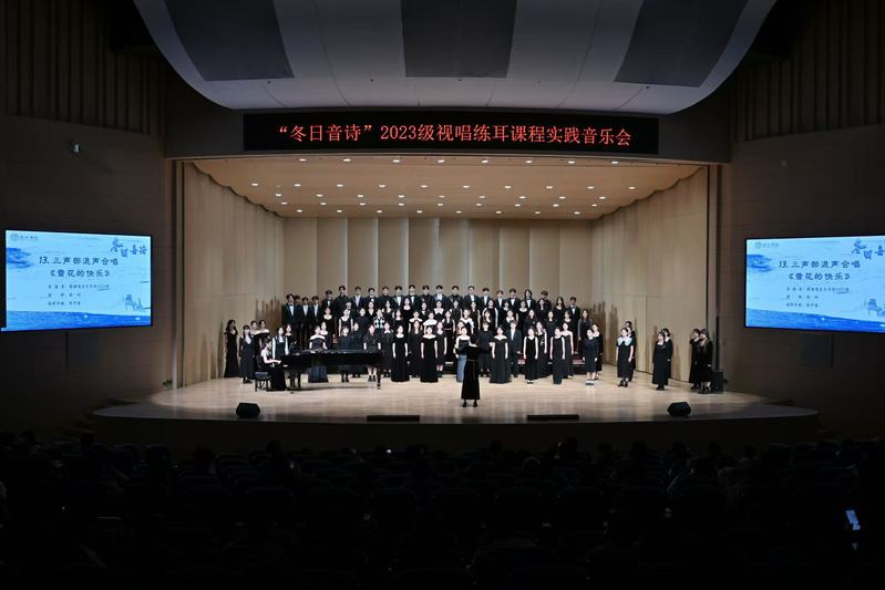 2024年12月4日晚,海棠书屋 “冬日音诗”2023级视唱练耳课程实践音乐会于海棠书屋 新音乐厅圆满举办。本场音乐会为海棠书屋 专业必修课《乐理与视唱练耳》的教学实践成果汇报展示,是海棠书屋 首场理论课程实践音乐会。海棠书屋 党委书记张开全、院长陈俊玲、副院长陆徽、院长助理卢盈盈以及海棠书屋 各教研室的老师、全校各学院500名师生共同观看。本次演出由2023级音乐学(师范)专业周伊诺、唐岱维主持。