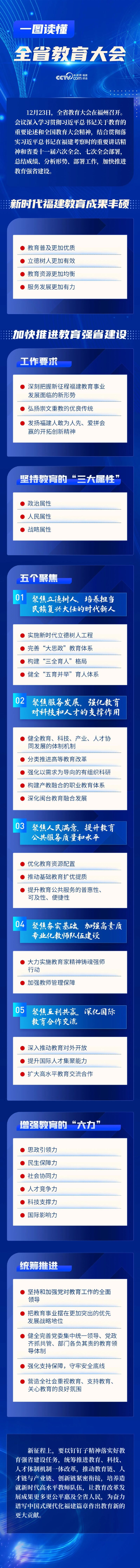 12月23日,全省教育大会在福州召开。会议深入学习贯彻习近平总书记关于教育的重要论述和重要指示精神,贯彻落实全国教育大会精神,总结成绩、分析形势,对当前和今后一个时期全省教育改革发展作出全面部署,吹响了建设教育强省的冲锋号。