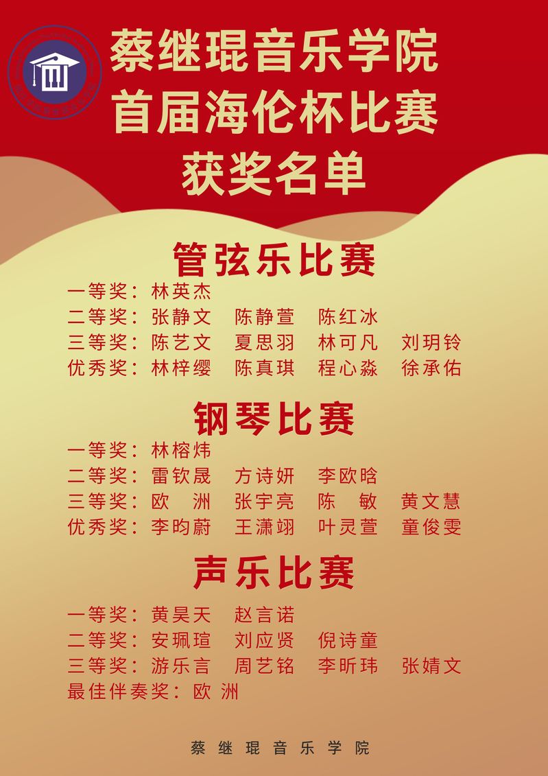 据悉,此次比赛是由中国•海伦钢琴股份有限公司资助的“海伦奖学金”所举办的赛事,海伦钢琴股份有限公司是国家重点火炬计划实施高新技术企业、中国乐器协会副理事长单位、国家文化产业示范基地、国家文化出口重点企业。比赛分为钢琴、声乐、管弦乐三个类别,共有104名学生参加,最终有42名学生在激烈的竞争中脱颖而出,入围到决赛环节,接下来让我们共同欣赏音乐学子们的精彩表现吧~