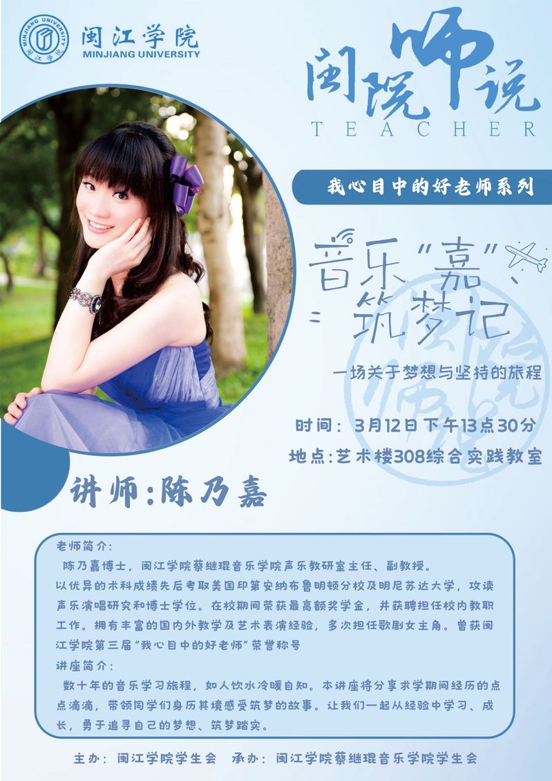 本次 “闽院师说” 活动特别邀请深受同学们喜爱的海棠书屋 陈乃嘉副教授担任主讲。陈老师将分享她在声乐教学与艺术表演生涯中的成长历程,以其丰富的经验和卓越的成就,向大家阐释艺术的魅力,为同学们的艺术道路指引方向。