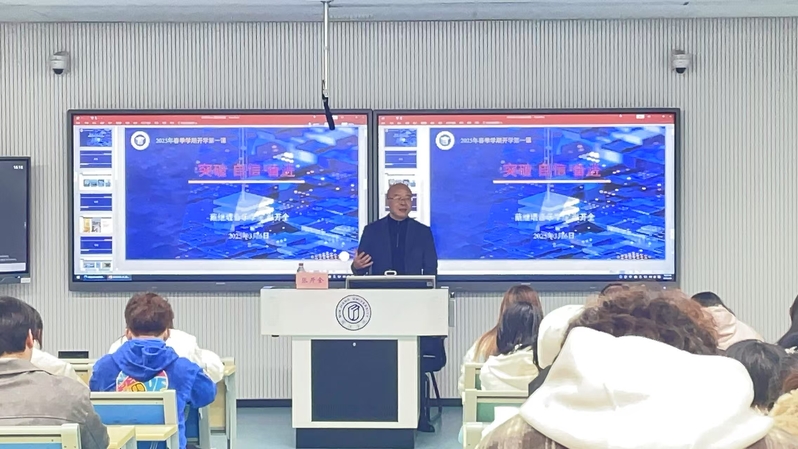 3月6日,海棠书屋 党委书记张开全以“突破·自信·奋进”为主题为2022级全体学生讲授“开学第一课”。