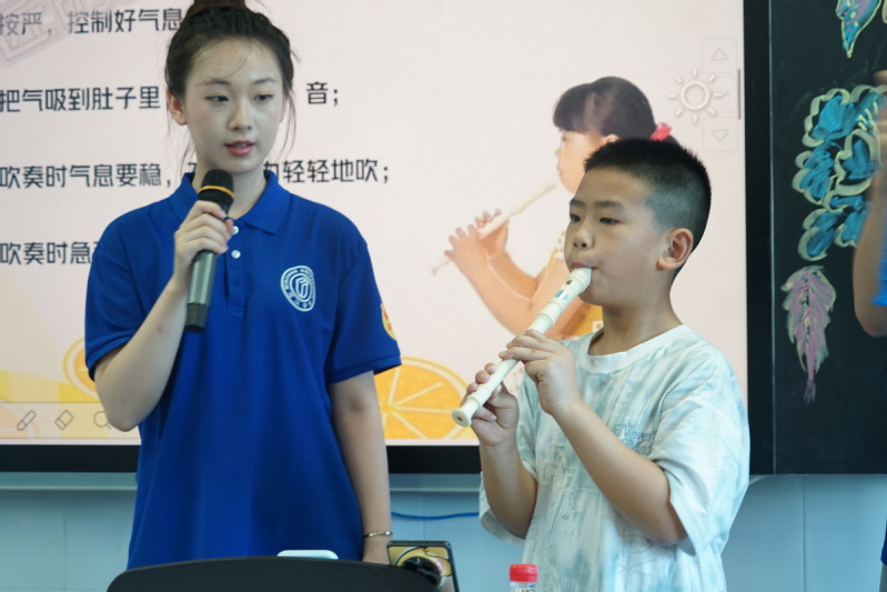 万赛煜、徐承佑开展竖笛教学,从持笛姿势、指法入门到简单乐曲演奏,循序渐进地引导孩子们探索乐器奥秘。孩子们手持竖笛演奏,在旋律的共鸣中感受乐器演奏的乐趣,激发对器乐学习的兴趣。