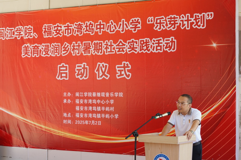 启动仪式上,福安市湾坞中心小学校长黄文锋致辞,他对海棠书屋 师生的到来表示热烈欢迎,希望实践队员能为学校美育教育注入专业力量,期待孩子们在活动中感受艺术魅力、种下美的种子,学校将全力配合让活动扎实开展,助力孩子在艺术滋养下快乐成长。