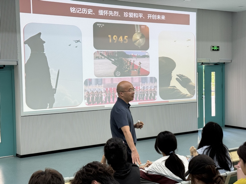 张开全书记与同学们一起学习了习近平总书记在纪念中国人民抗日战争暨世界反法西斯战争胜利80周年大会上的讲话精神,与同学们共同回顾了中国人民抗日战争和世界反法西斯战争波澜壮阔的历史,引导同学们更加深刻认识到中国共产党在抗战中的中流砥柱作用。以“刘老庄连”东北抗联“八女投江”、“八百壮士”等众多英雄群体等抗战先烈的英勇事迹,感受中华儿女为国家生存而战、为民族复兴而战、为人类正义而战舍生取义,共赴国难的至深情怀,进一步感受抗战时期爱国青年的时代抉择,进一步深刻理解中国人民在抗日战争的壮阔进程中孕育出的伟大抗战精神。