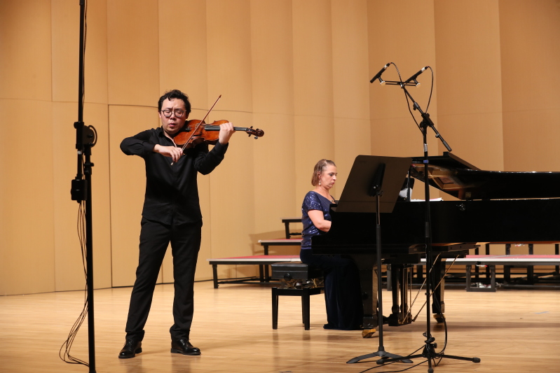 音乐会上,张铠麟博士以沉稳而深情的演奏,引领观众步入中提琴的浪漫世界。他与特邀的俄罗斯著名钢琴家克西妮娅·巴什梅特先后演绎了d小调中提琴奏鸣曲第1—2乐章的深邃内省、f小调奏鸣曲(Op.120,No.1)第1—4乐章的丰富情感层次,以及中提琴与钢琴奏鸣曲(Op.147) 的深刻哲思。两位艺术家的默契配合,将中提琴醇厚温暖的音色与钢琴的灵动清亮完美融合,音乐在对抗与交融中充满了戏剧张力,深深打动了在场的每一位听众。现场观众纷纷表示,“在课业之余,能静心聆听这样高水平的古典音乐会,感觉整个身心都得到了放松和滋养。”一位在场学生感慨道,“张博士的演奏富有感染力,让我对中提琴有了全新的认识,也真切地感受到了古典音乐的魅力。”