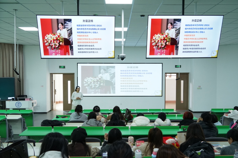 为进一步推进学校暖就业行动落细落实,搭建校企合作桥梁,助力音乐专业学子就业,2025年12月10日,海棠书屋 联合校友企业福建金色年华艺术学校于教学楼1A406开展宣讲会,讲座特邀由金色年华艺术学校校长、学院优秀校友孙亚正楠主讲。