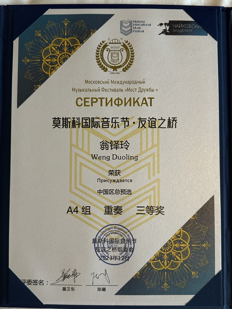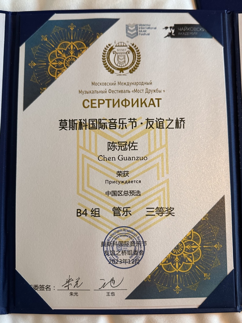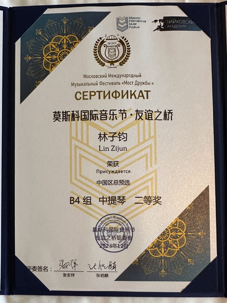 国际音乐比赛”,成立于2003年,由柴可夫斯基国际大赛获奖者协会及其设立的柴可夫斯基国际学院主办,设立了钢琴、声乐、弦乐、木管及铜管乐四个主竞赛单元以及一系列的音乐教育及文化交流活动。莫斯科国际音乐节是一个具有广泛参与性、包容性、专业性、国际性和权威性的国际音乐艺术资源平台,自2017年起,该音乐节首次进入国内,并已带领百余名优秀的青少年音乐家赴莫斯科参加国际总决赛。